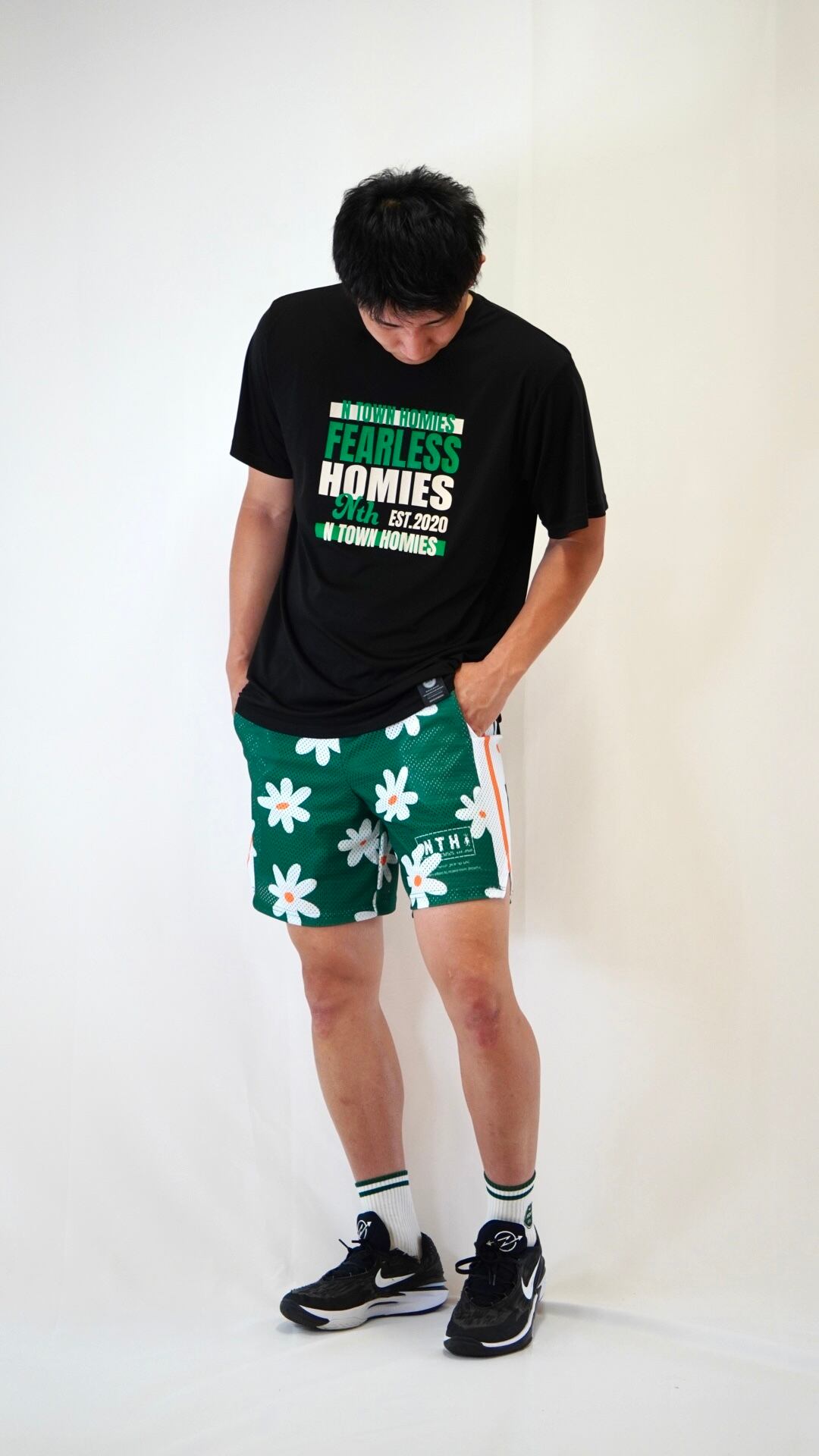 グリーンベースに咲き誇る花模様が、力強さとやわらかさを共存させる独自のスタイルを演出します。